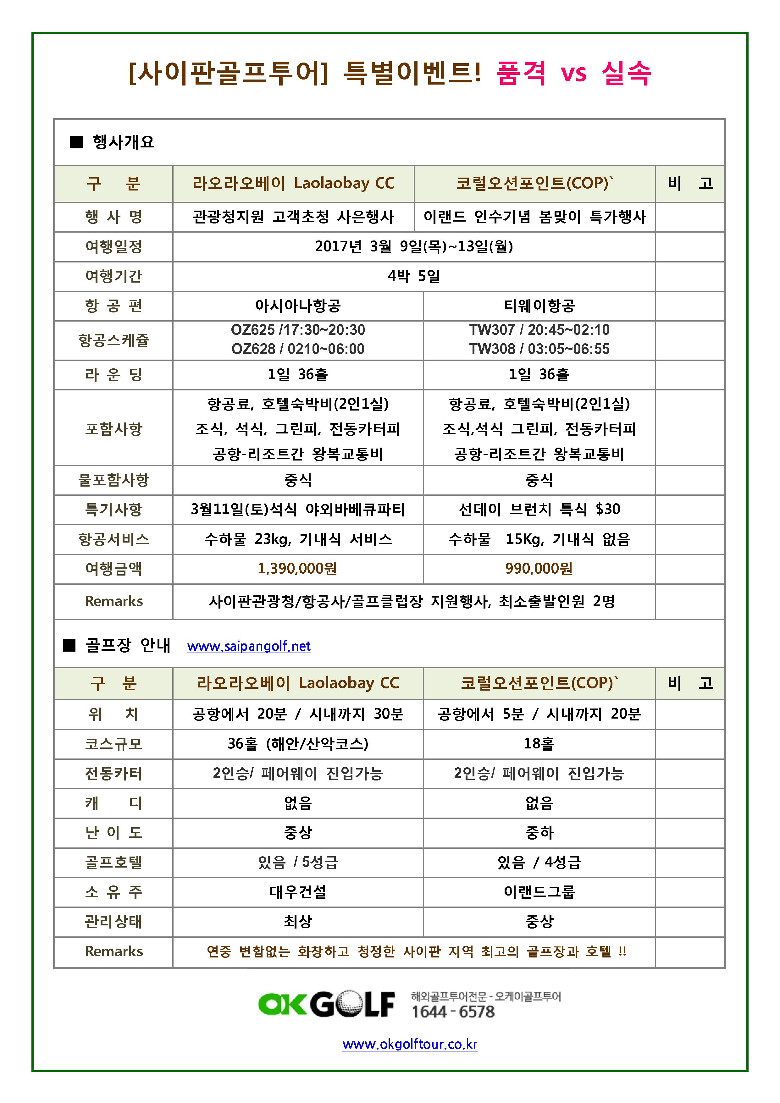 ■ 행복한 선택 사이판골프 봄 맟이 프로모션 행사, 품격vs 실속! 2017년 3월 9일 새봄을 맞이하면서 사이판에서 특별한 골프프그램 두가지가 진행됩니다 . 관광청에서 후원하고, 아시아나항공 협조로 진행되는 라오라오베이 골프 VIP고객초청 사은행사 (연중 단 한번 진행)와 코럴오션포인트 (COP) 봄맞이 특가 이벤트 입니다 . ● 일 정 : 2017년 03월09일~13일(4박5일) 단 한번 출발! ● 출발인원 : 2명 이상 [사이판관광청후원] 라오라오베이 VIP 초청사은행사 - 항공편 : 아시아나항공 - 골프장 : 라오라오베이(1일 36홀 라운딩) - 숙 소 : 라오라오베이호텔( 5성급/ 2인 1실 ) - 금 액 : 1,390,000원 /인 - 중식 외 올포함 항공스케쥴 (아시아나항공) - 출국(3/09) OZ 625-17:30~20:30 - 귀국(3/13) OZ 628- 0210~06:00 ■ 라오라오베이 세부일정 보기 https://goo.gl/o6NTVc ■ 라오라오베이 골프장 안내 http://saipangolf.modoo.at/?link=cx0vx638 ■ 라오라오베이 안내동영상 https://youtu.be/YzWIoc42BqE 특전사항 - 연중 변함없는 화창하고 청정한 사이판 지역 최고의 골프장과 호텔이용 - 이스트코스 18홀 + 웨스트코스 18홀을 갖춘 라오라오베이 C.C에서 매일 36홀 라운딩! - 아시아나항공과 5성급 골프호텔을 이용하는 힐링 품격골프투어 - 노팁! 노쇼핑 행사! 3월 11일(토) 석식은 리조트 수영장에서 바비큐로 진행합니다. - 타사 상품대비 무려 70여만원이 저렴한 특가 이벤트 입니다. 코럴오션포인트(COP) -봄맞이 특가이벤트 - 항공편 : 티웨이항공 - 골프장 : 코럴오션포인트(COP )1일 36홀 라운딩 - 숙 소: COP 골프리조트( 2인 1실 ) - 여행금액 : 990,000원/인 - 중식 외 올포함 항공스케쥴(티웨이항공) 1) 출국(03/09) TW307 / 20:45 -02:10 2) 귀국 (03/13) TW308 / 03:05~06:55 ■ COP 세부일정표 보기 https://goo.gl/i9QJAe ■코럴오션포인트 안내 http://goo.gl/blXsxr ■코럴오션포인트 안내동영상 https://youtu.be/wPbFuJjhujs ![]() 드리는 말씀 1) 시내 면세점 & 카지노에서 운영하는 셔틀버스를 이용해 자유롭게 시내이동 & 관광이 가능합니다.( 왕복 $7) 2) 여권유효기간은 6개월 이상 남아있어야 합니다 . 3) 사이판은 미국령으로 무비자 입국 45일 가능합니다 (단, 미국비자 발급거절 경험이 있는 분은 입국불가) 남태평양의 시원한 바닷바람을 맞으며, 사이판에서 가장 아름다운 골프장에서 라운딩을 즐겨 보세요!! 항공좌석(40석) 선착순 마감. 좌석 소진전에 속히 예약하세요. 감사합니다 ☎ 예약문의 : 오케이골프투어 1644-6578 진행담당 : 과장 우정희 010-3621-6513 ![]()