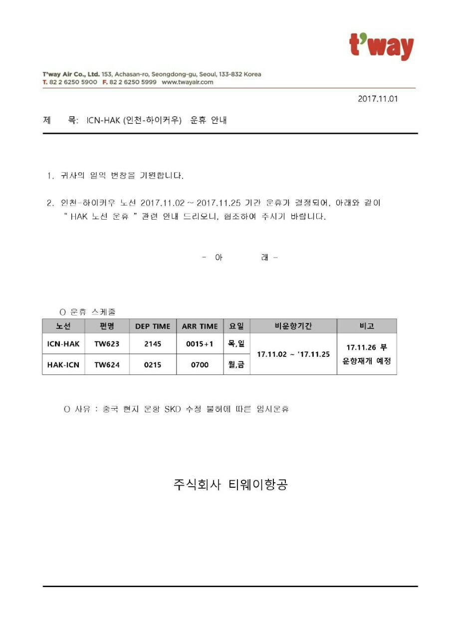 안녕하세요? 하이난 해구 직항 티웨이 항공 운휴 소식 및 아시아나항공 취항 소식입니다. 1. 지난 7월부터 1년 예정으로 하이난 해구로 취항하던 티웨이항공이 운항을 잠정 중단하게 되었습니다 . 2. 11월 한달만 운휴후 재개한다는 통보를 받았는데데 조종사 운용과 현지공항의 슬롯사용문제 등 내외부 문제로 무기한 운휴에 들어가게 되었습니다 . 3. 2018년 1월부터 2월말까지 주 2회 ( 목, 일) 아시아나항공이 전세기 운항을 시작하게 되어 1월 예약하신 분들은 아시아나항공으로 변경이 가능하고, 일정변경이 어려우신 분들은 제주항공편을 이용해 산야(삼아)로 경유하는 방법이 있습니다 . 4. 현재 티웨이항공을 대신 할 수 있는 다른 항공편 - 남방항공을 이용한 광조우 경유 해구행 스케쥴을 모색중에 있습니다 . 확정되는대로 공지해 드리도록 하겠습니다. 5. 항공사의 갑작스런 조치로 인해 불편을 드리게 되어 거듭 송구합니다 . # 첨부 : 티웨이항공 운휴 공문