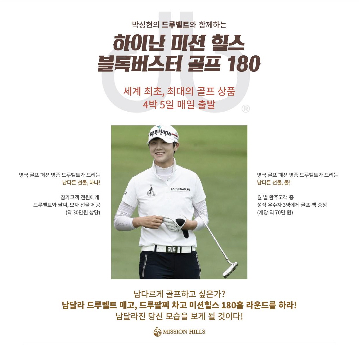 ▣ 블록버스터 180 H 참가자 & 완주자에게 드리는 특별한 선물! ① 180홀 참가자 - 매월 20명 / 11월 30일까지 총 200명 한정 선착순) - "드루벨트1개+드루팔찌1개+드루모자1개=총 30만원 상당"을 무상 제공합니다. ② 180홀 완주자 - 매월 성적 우수자 3명 / 11월 30일까지 총 27명 한정 - "골프백 1개(70만원 상당, 'Mission Hills Blockbuster Golf 180 완주자 홍길동' 자수 새김)"을 제공합니다.