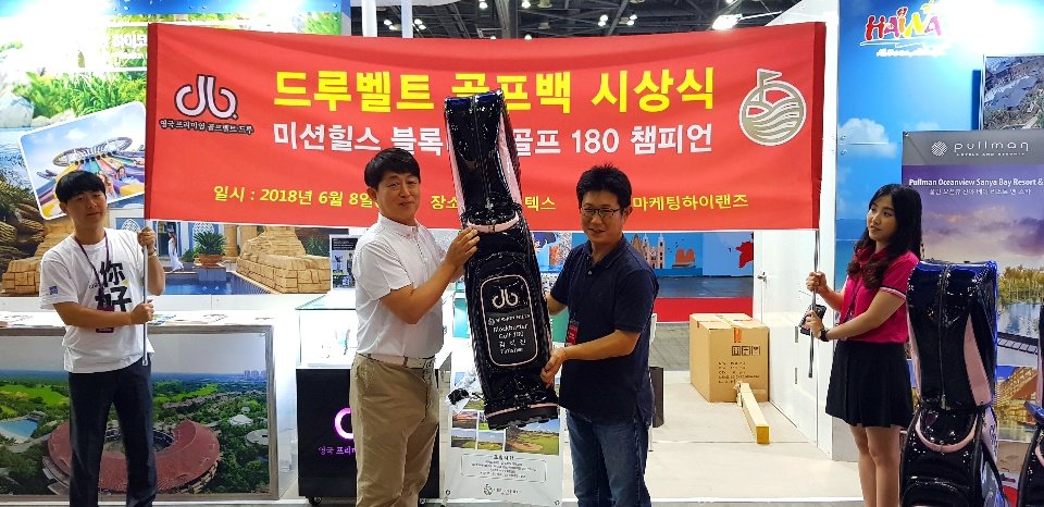 미션힐스 블록버스터 180 완주자 성적우수자 드루벨트 골프백 시상식 표정입니다. - 2018년 6월 8일 킨텍스 여행박람회 미션힐스 부스에서 진행. - 드루코리아 강명호 대표와 미션힐스 한국담당 이사, 미션힐스 한국GSA 관계자 및 오케이골프투어 총괄이사가 참석해 성료. - 수상고객 네명이 참석했는데 멀리 제주도에서 날아온 열성 고객도 ~ - 미션힐스 블록버스터 180 참가만으로 감동이었는데 영광이란 공통된 소감~ - 워낙 훌륭한 골프코스였고 평생잊지 못할 라운딩에 골프백 까지 수상해 앞으로 미션힐스 전도사가 되겠다는 각오까지. 마치 미션힐스180 홍보팀 발대식 같은 분위기였습니다.