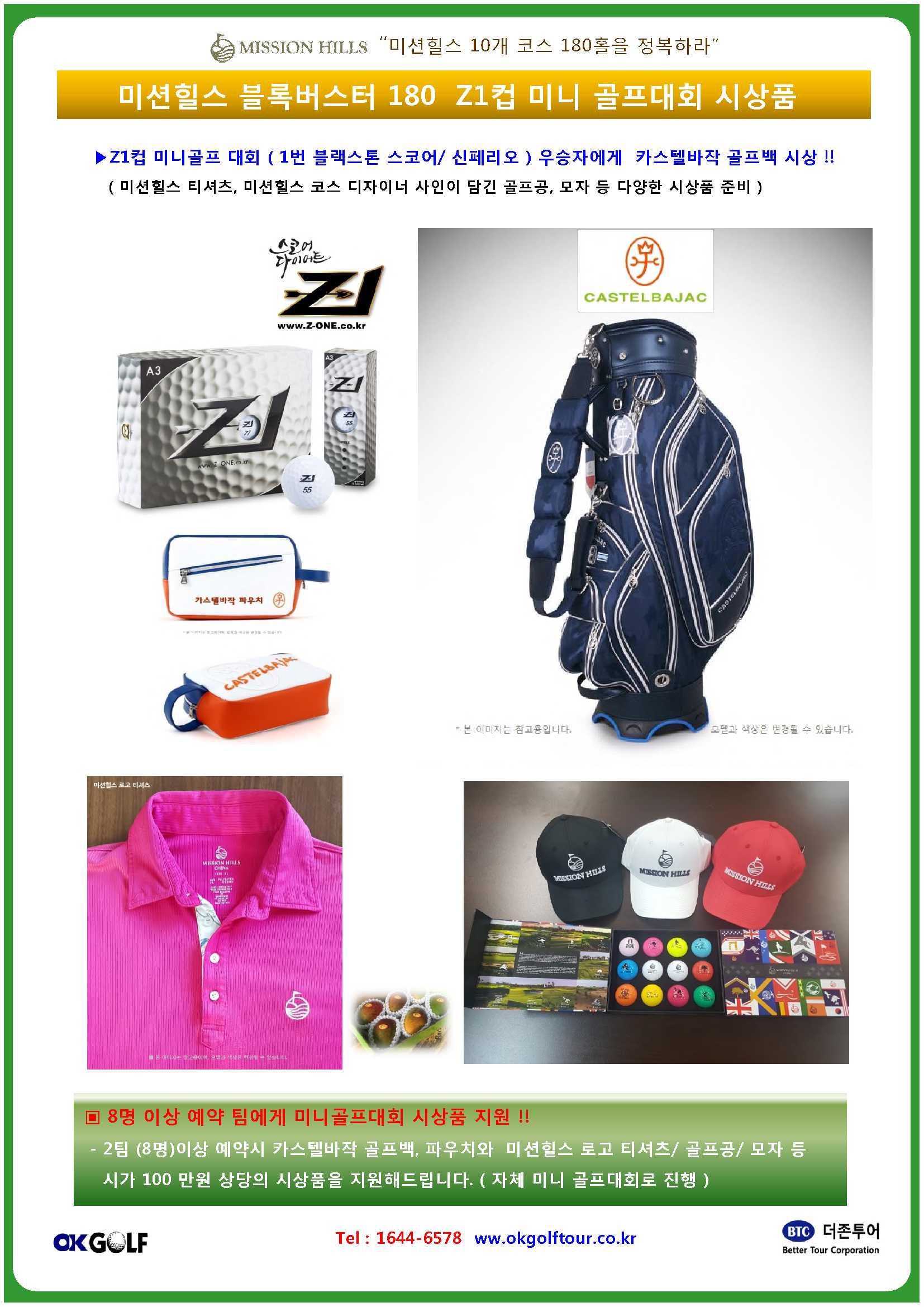 => 3월 16일 미션힐스 특별 이벤트 150석 전석 마감 !! 성원에 감사드립니다 . => Again, One more !! 3월 23일 출발 ( 50석 한정) ![]() Again, MissionHills Golf Block Buster 180H !! =>3월 16일 미션힐스 특별이벤트 150석 전석 마감 !! 성원에 감사드립니다 . => Again, One more !! 3월 23일 출발 ( 50석 한정) 3월 16일 행사는 150석 전 좌석이 마감되어, 미처 예약하시지 못한 분을 위해 3월 23일 한번 더 행사를 진행합니다 .? 이번 3월 23일 행사는,? 1. 180홀 완주하신 모든 분에게 미션힐스 기념 볼 한 더즌( 12개)을 제공해 드립니다. 2. 미니골프 대회를 통해 골프 백과 다양한 기념품을 제공합니다. 3. 특히, 2팀( 8명 )이상 예약하신 그룹에게는 팀별 골프대회가 가능하토록 100만원 상당의 시상품을 지원합니다 ( 골프백, 파우치, 미션힐스 티셔츠, 기념볼 등) ![]() ▣ Z1컵 미니골프 대회 진행 ( 최소 30명 이상 출발시) - 모든 참가자 대상 1번 블랙스톤 코스 스코어를 기준으로 미니골프대회 진행 - 우승자에게 카스텔바작 골프백 시상 (시가 70만원 상당 / 신페리오 방식) - 메달리스트, 다 버디상, 다 보기상 등 - 미션힐스 티셔츠, 미션힐스 코스 디자이너 사인이 담긴 골프공, 모자 등 다양한 시상품 준비 ▶ 8명 이상 예약 팀에게 미니골프대회 시상품 ( 시가 100만원 상당) 지원 !! - 2팀 (8명)이상 예약시 - 골프백, 파우치와 미션힐스 로고 티셔츠/ 골프공/ 모자 등 시가 100 만원 상당의 시상품을 지원해드립니다. - 자체 미니 골프대회나 이벤트로 진행 ![]() ![]() ![]() ▣ 세부 일정표 보기 http://bitly.kr/mh0323 ▣ 미션힐스 공식 밴드 https://band.us/@missionhills |